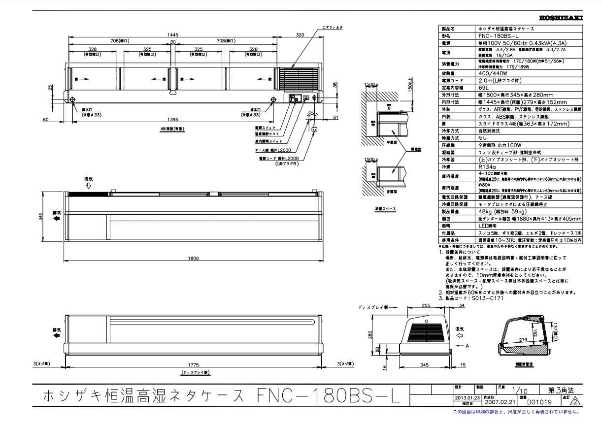 商品名:恒温高湿ネタケース FNC-180BS-L 幅1800×奥行345×高さ280(mm) 単相100V