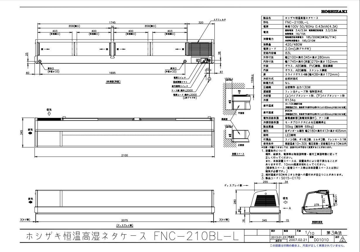【ホシザキ】恒温高湿ネタケース FNC-210CL-L 幅2100×奥行345×高さ280(mm) 単相100V