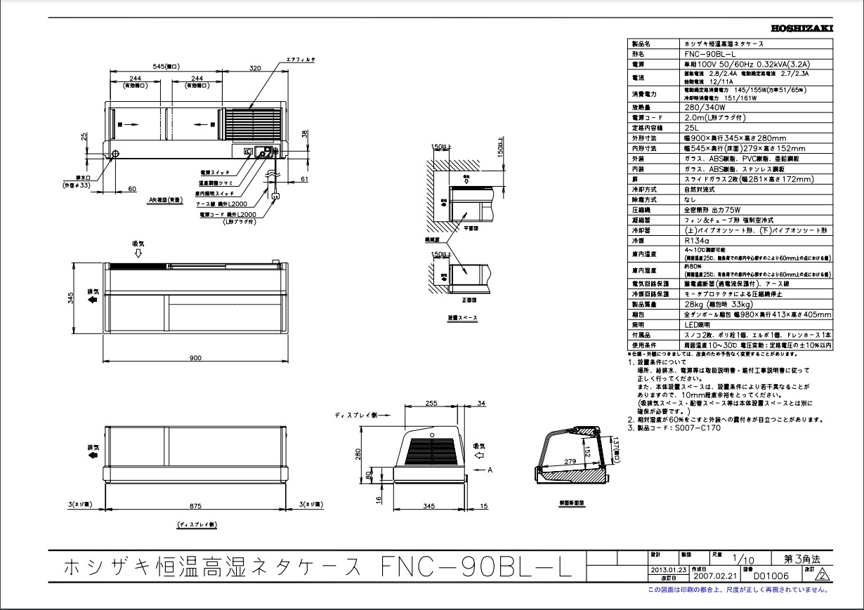商品名:恒温高湿ネタケース FNC-90BL-L 幅900×奥行345×高さ280(mm) 単相100V