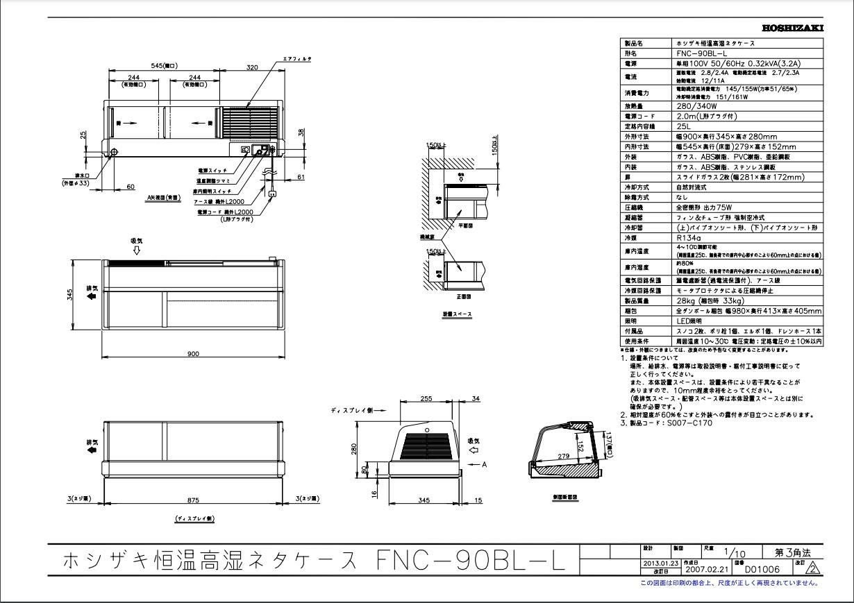 商品名:恒温高湿ネタケース FNC-90CL-L 幅900×奥行345×高さ280(mm) 単相100V