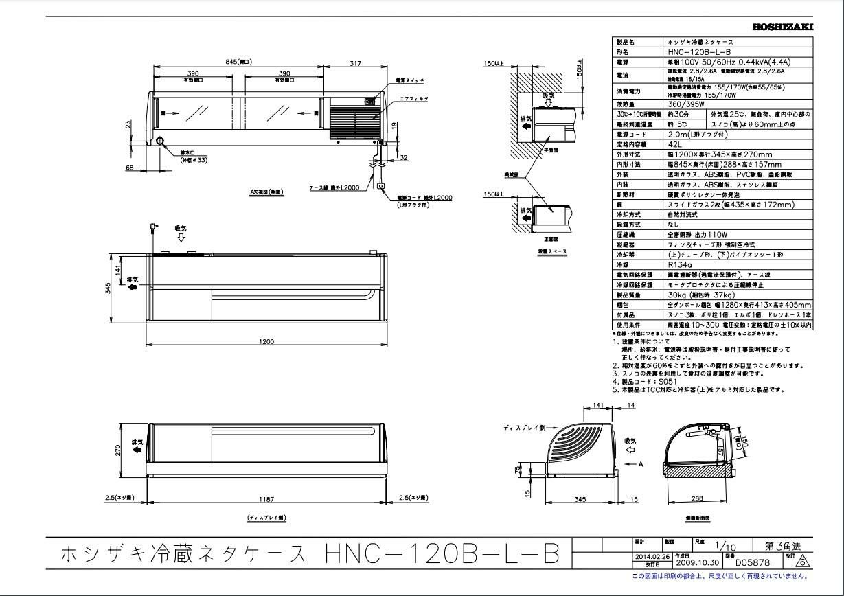 商品名:冷蔵ネタケース 左ユニット HNC-120B-L-B 幅1200×奥行345×高さ270(mm) 単相100V