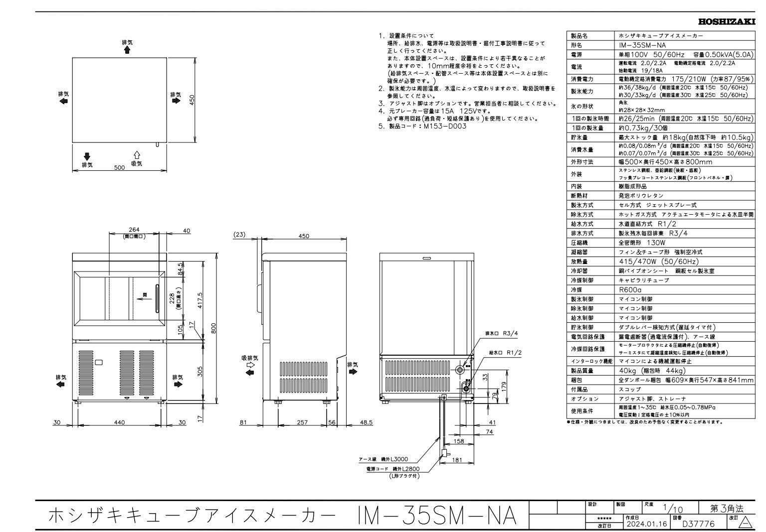 商品名:キューブアイスメーカー(バーチカル) IM-35SM-2 幅500×奥行450×高さ800(mm) 単相100V
