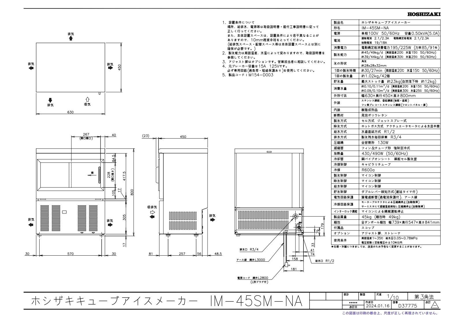 商品名:キューブアイスメーカー(バーチカル) IM-45SM-2 幅630×奥行450×高さ800(mm) 単相100V