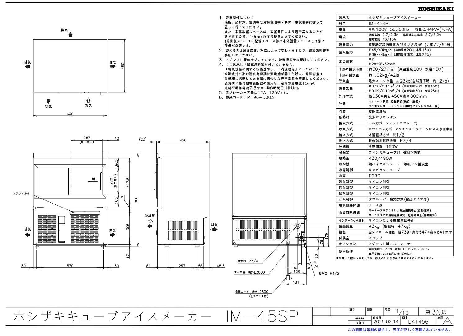 ※製氷能力の項目中、上段は室温20℃水温15℃、下段は室温30℃水温25℃の数値です。