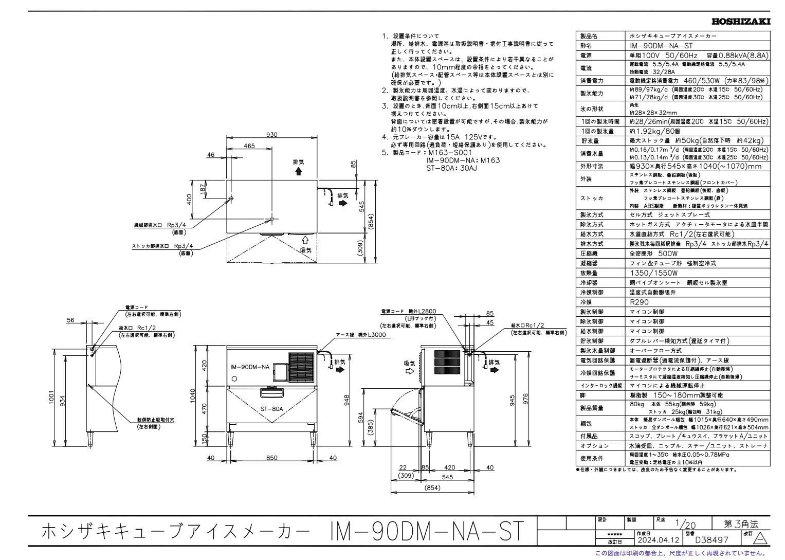 商品名:キューブアイスメーカー(スタックオン) IM-90DM-1-ST 幅930×奥行545×高さ1040(mm) 単相100V