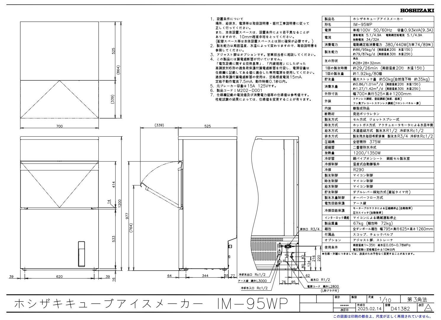 IM-95WP【ホシザキ】自然冷媒製氷機キューブアイスメーカー水冷式 バーチカルタイプ 製氷能力95kg幅700×奥行525×高さ1200mm単相100V【受注生産品】