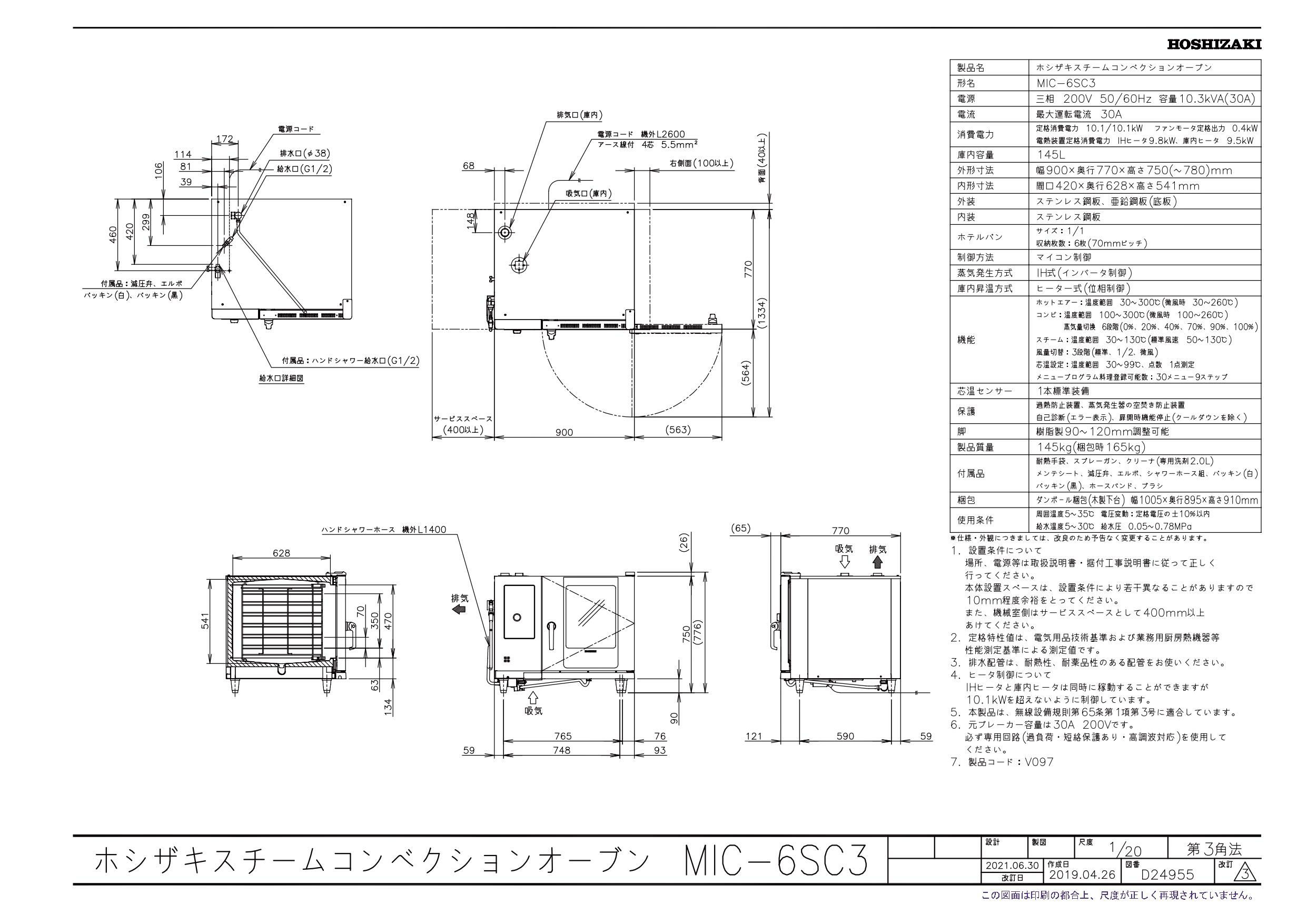 商品名:スチームコンベクションオーブン MIC-6SC3 900×700×750(mm) 三相200V