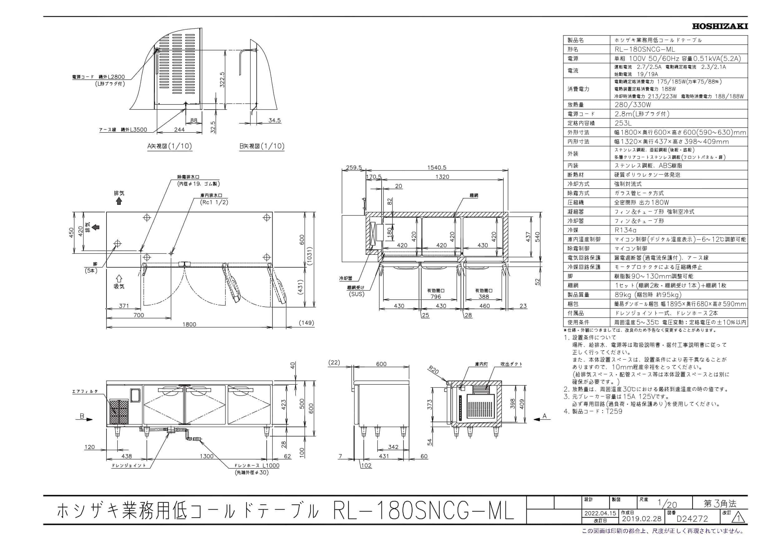 RL-180SNCG-ML 【ホシザキ】低コールドテーブル 幅1800×奥行600×高さ600(590~630) 単相100V