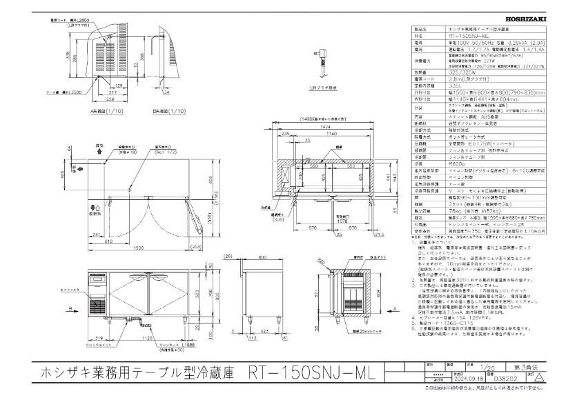 RT-150SNJ-ML 【ホシザキ】 ノンフロン テーブル形冷蔵庫(内装ステンレス、インバーター) 幅1500×奥行600×高さ800 単相100V