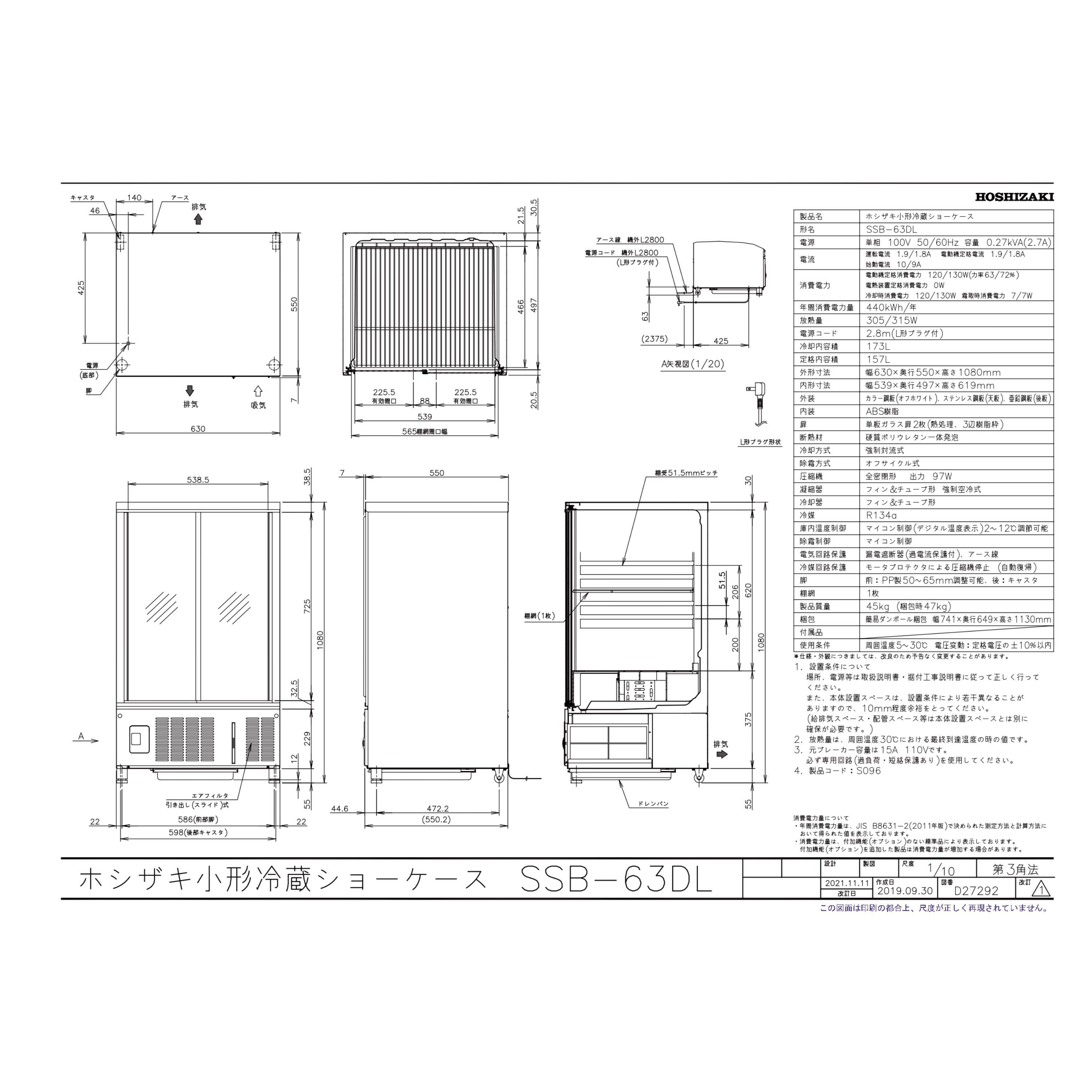 【ホシザキ】小型ショーケース SSB-63DTL 幅630×奥行450×高さ1080 単相100V