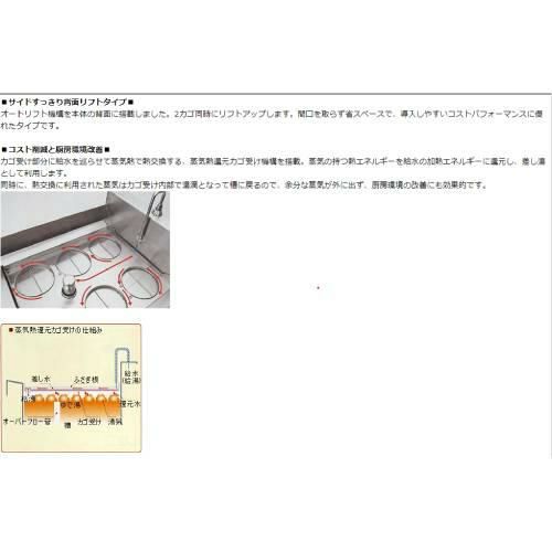 同時に、熱交換に利用された蒸気はカゴ受け内部で湯滴となって槽に戻るので、余分な蒸気が外に出ず、厨房環境の改善にも効果的です。