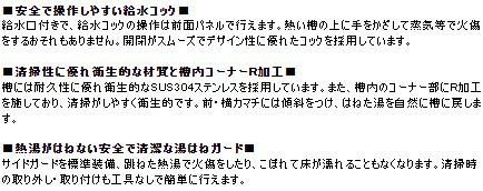 給水口付きで、給水コックの操作は前面パネルで行えます。熱い槽の上に手をかざして蒸気等で火傷をするおそれもありません。開閉がスムーズでデザイン性に優れたコックを採用しています。