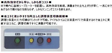 ゆで槽内に直接シーズヒーターを配置し、高熱効率を実現。沸騰までの立ち上がりが早く、一気にゆであげるので麺の旨さを損なわず、しかもランニングコストを抑えます。