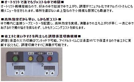 ゆで槽内に直接シーズヒーターを配置し、高熱効率を実現。沸騰までの立ち上がりが早く、一気にゆであげるので麺の旨さを損なわず、しかもランニングコストを抑えます。