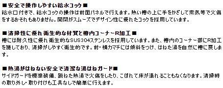 給水口付きで、給水コックの操作は前面パネルで行えます。熱い槽の上に手をかざして蒸気等で火傷をするおそれもありません。開閉がスムーズでデザイン性に優れたコックを採用しています。