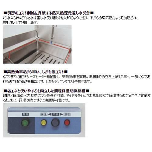 ゆで槽内に直接シーズヒーターを配置し、高熱効率を実現。沸騰までの立ち上がりが早く、一気にゆであげるので麺の旨さを損なわず、しかもランニングコストを抑えます。