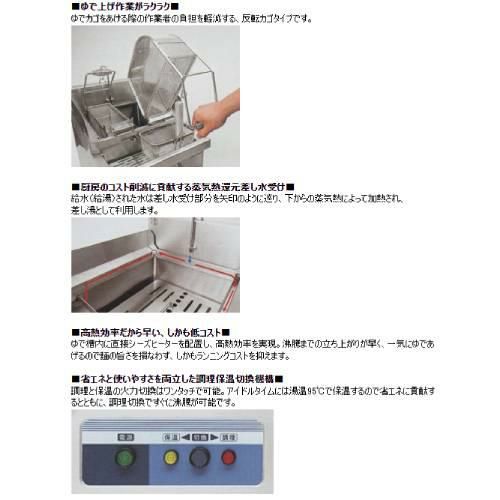 ゆで槽内に直接シーズヒーターを配置し、高熱効率を実現。沸騰までの立ち上がりが早く、一気にゆであげるので麺の旨さを損なわず、しかもランニングコストを抑えます。