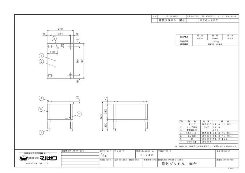 【マルゼン】電気グリドル専用架台 (MEG-046用) MEG-4FT 幅450×奥行600×高さ500mm