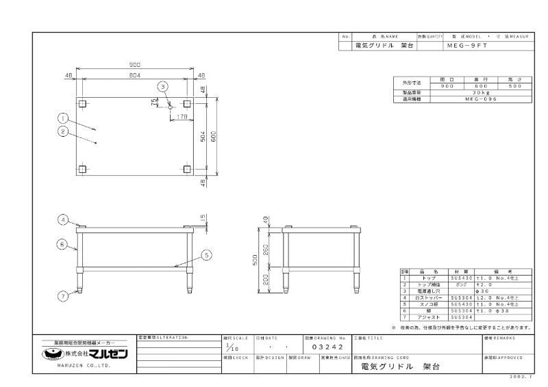 【マルゼン】電気グリドル専用架台 (MEG-096用) MEG-9FT 幅900×奥行600×高さ500mm