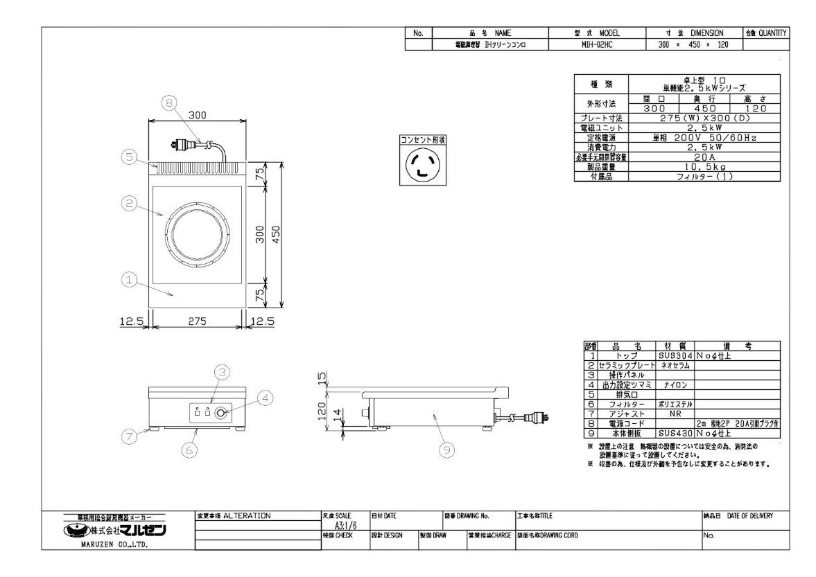 MIH-02HC 【マルゼン】IHクリーンコンロ卓上型 単機能2.5kWシリーズ 標準プレート 幅300×奥行450×高さ120