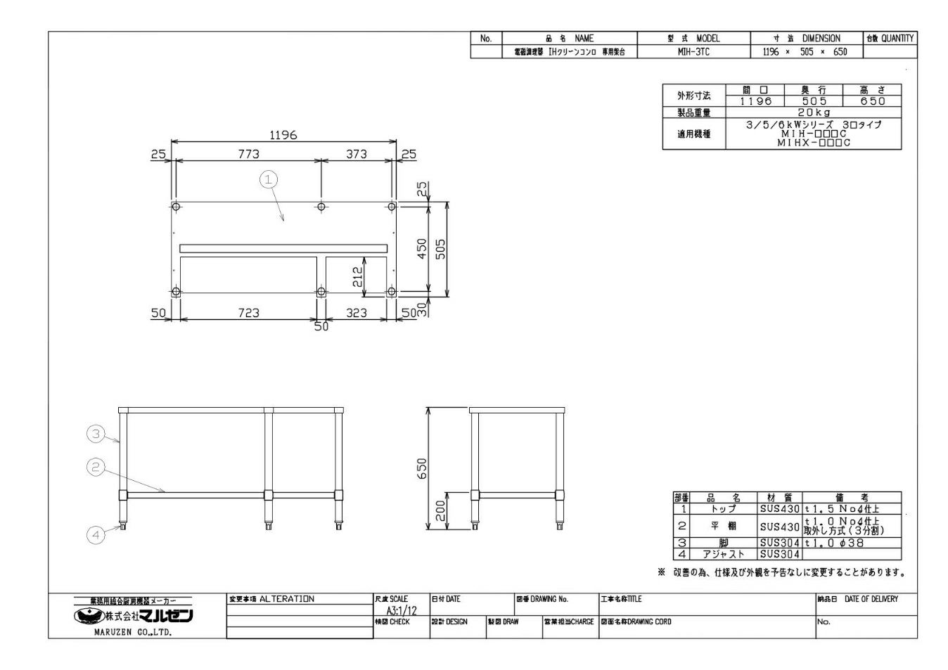 MIH-3TC 【マルゼン】IH調理器 卓上型3口タイプ専用架台 幅1196(1200)×奥行505(600)×高さ650(800)