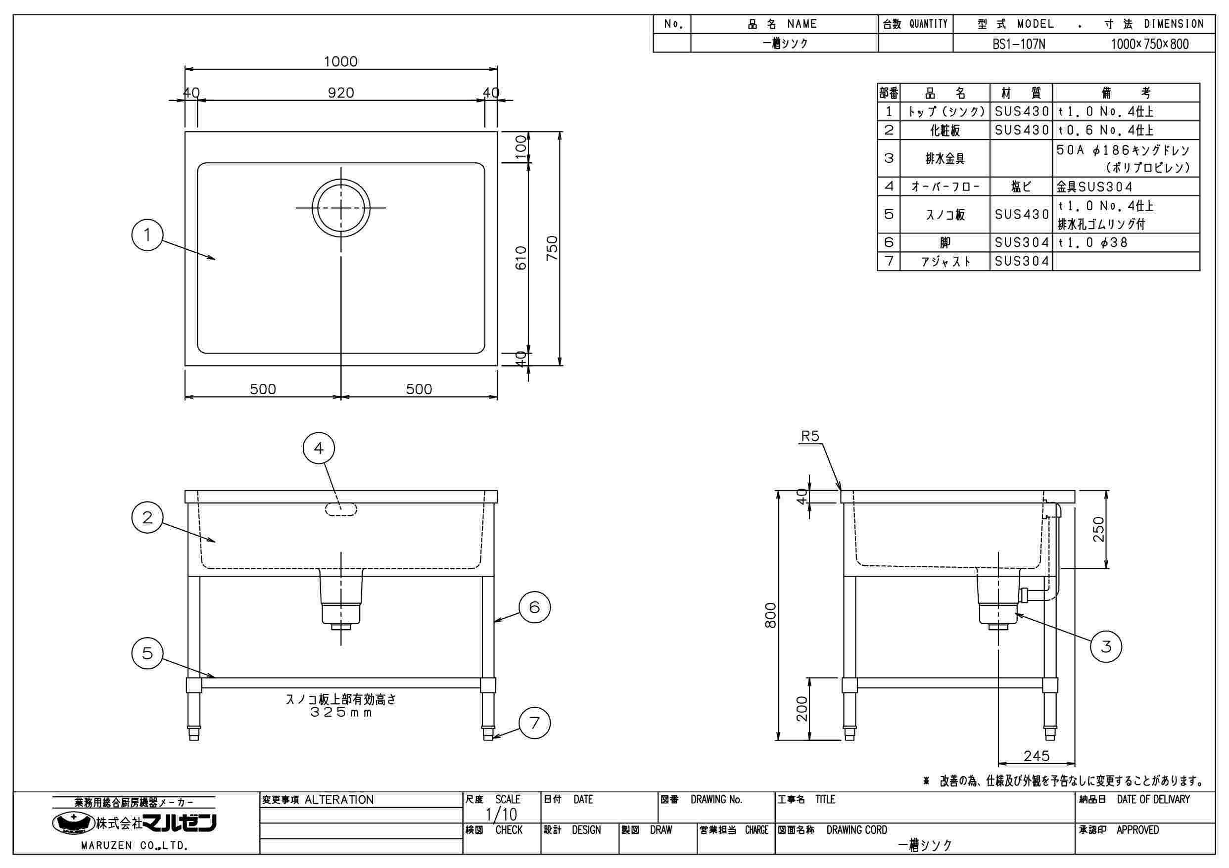 【3月末までのお届け分限定価格】BS1-107N 【マルゼン】 一槽シンク バックガードなし 幅1000×奥行750×高さ800mm