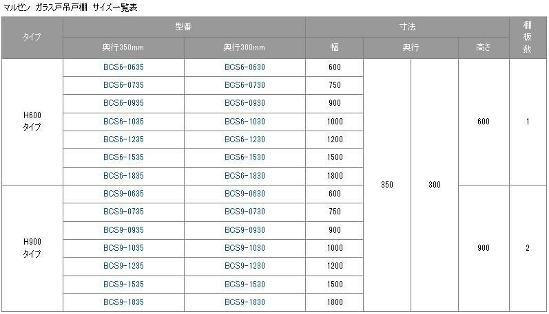 マルゼン ガラス戸吊戸棚 サイズ一覧表