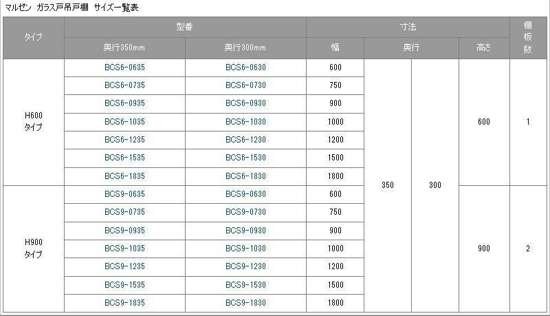 マルゼン ガラス戸吊戸棚 サイズ一覧表
