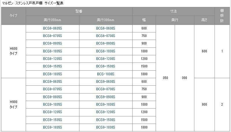 マルゼン ステンレス戸吊戸棚 サイズ一覧表