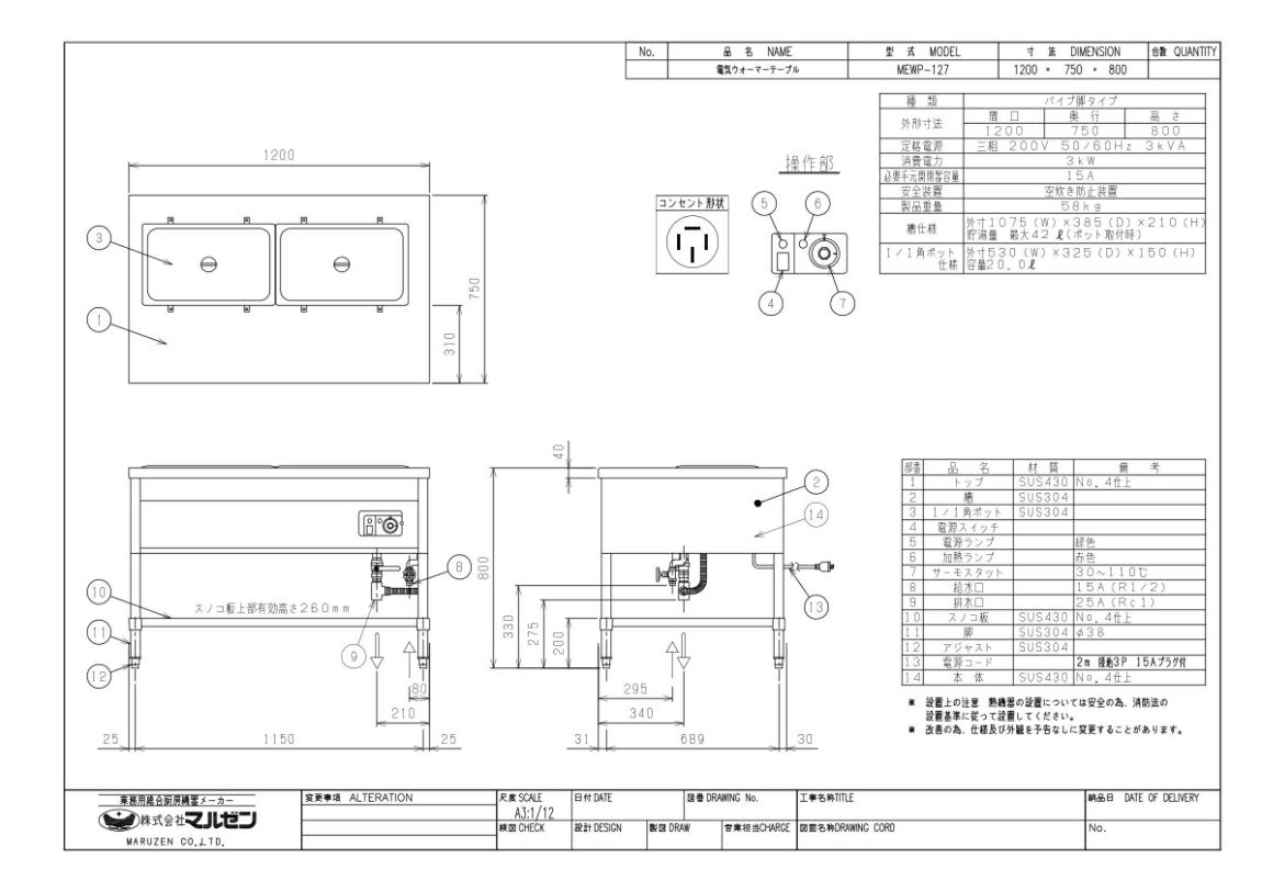 【マルゼン】電気ウォーマーテーブル 幅1200×奥行750×高さ800mm