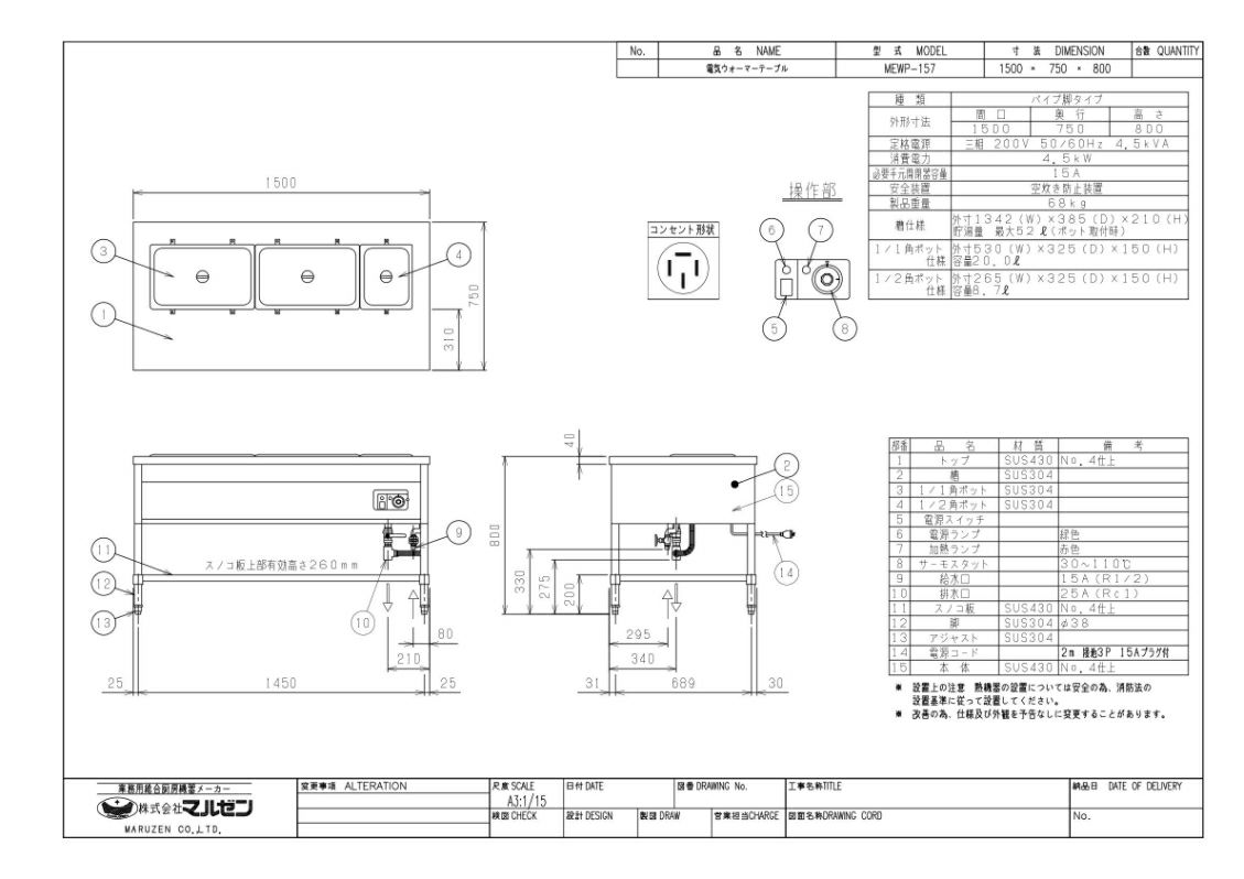 【マルゼン】電気ウォーマーテーブル 幅1500×奥行750×高さ800mm