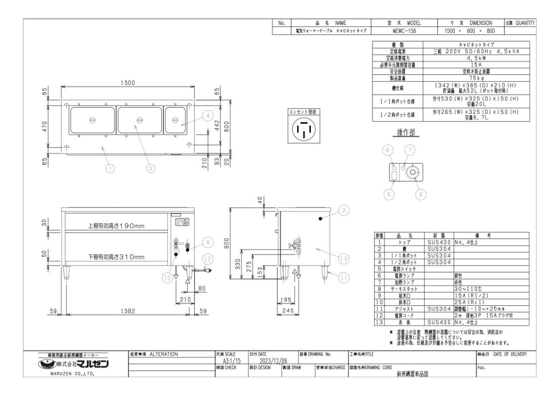 商品名:電気ウォーマーテーブル キャビネットタイプ W1500×D600 角型1/1×2+1/2×1