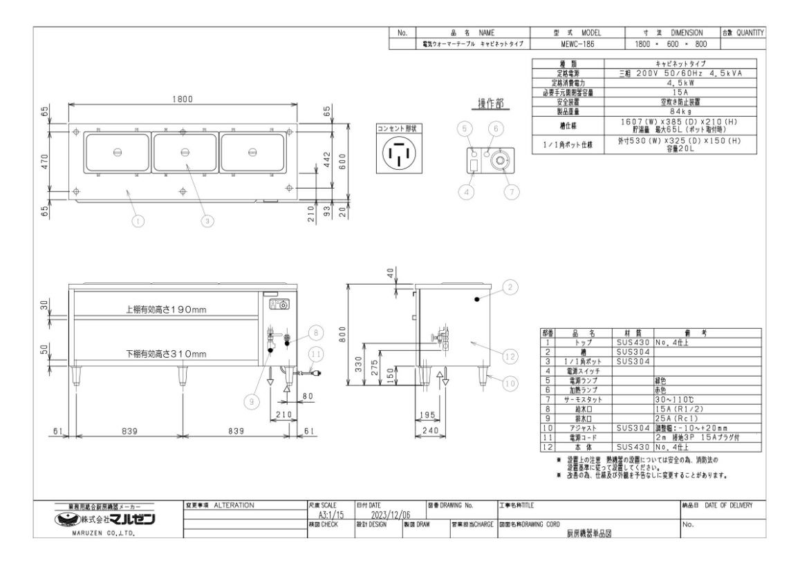 商品名:電気ウォーマーテーブル キャビネットタイプ W1800×D600 角型1/1×3