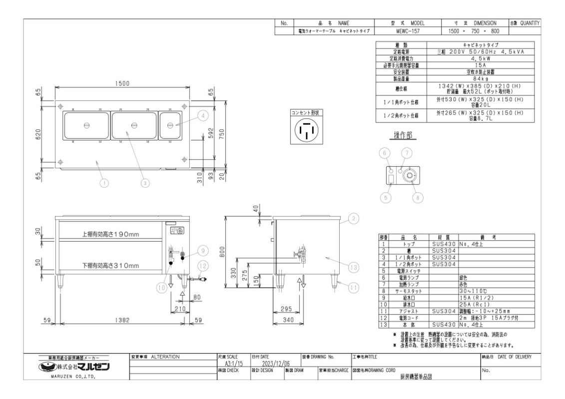 商品名:電気ウォーマーテーブル キャビネットタイプ W1500×D750 角型1/1×2+1/2×1