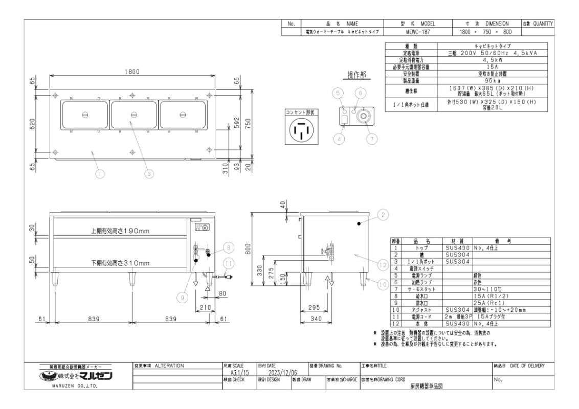 商品名:電気ウォーマーテーブル キャビネットタイプ W1800×D750 角型1/1×3