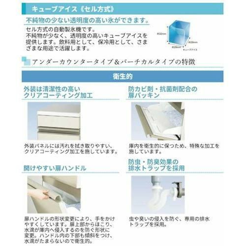 セル方式の自動製氷機です。不純物が少なく、透明度の高いキューブアイスを提供します。