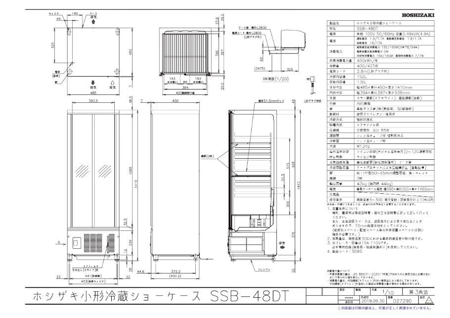 【定期点検5年サービス付き】【ホシザキ】小型ショーケース SSB-48DT 幅485×奥行450×高さ1410 単相100V