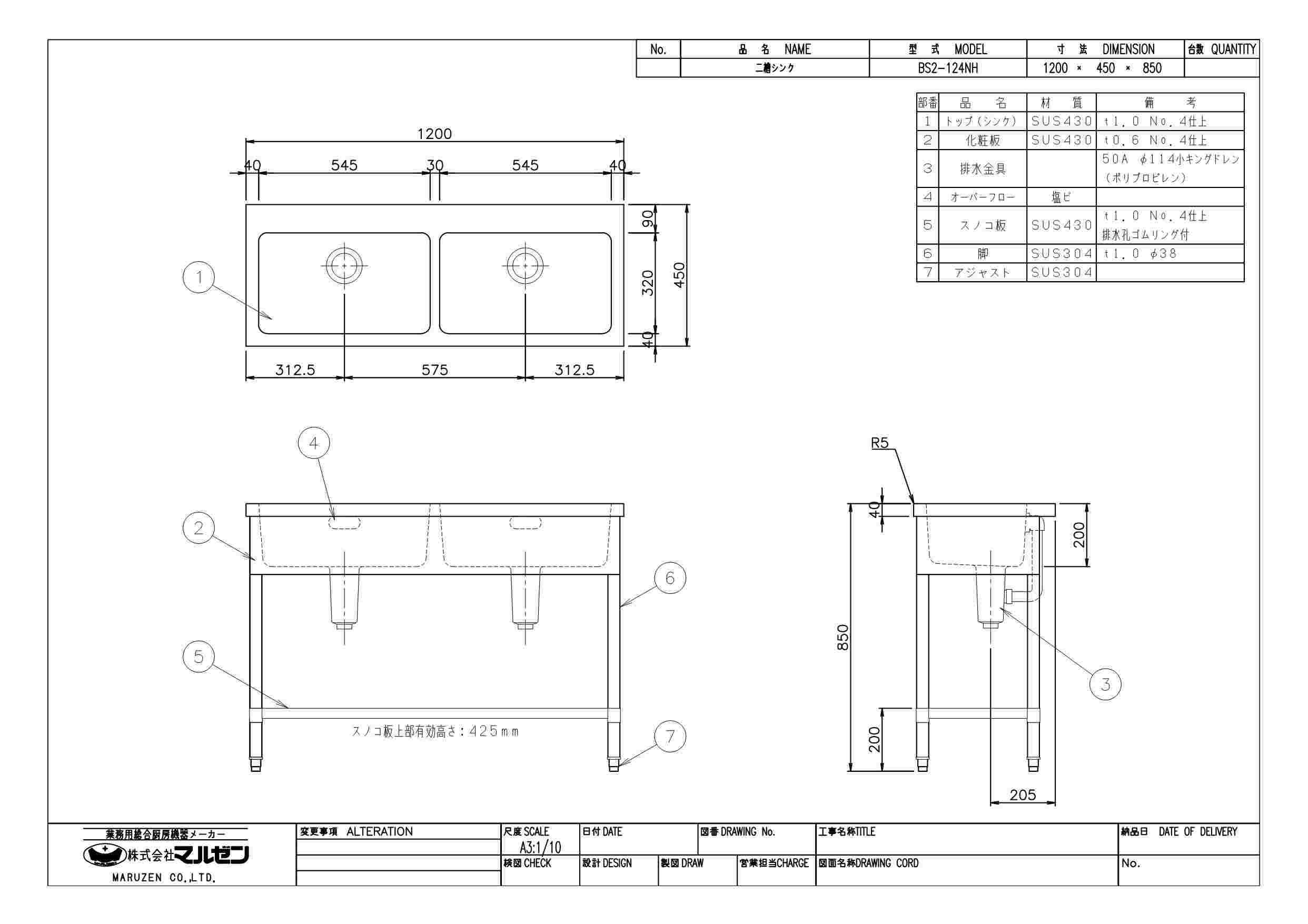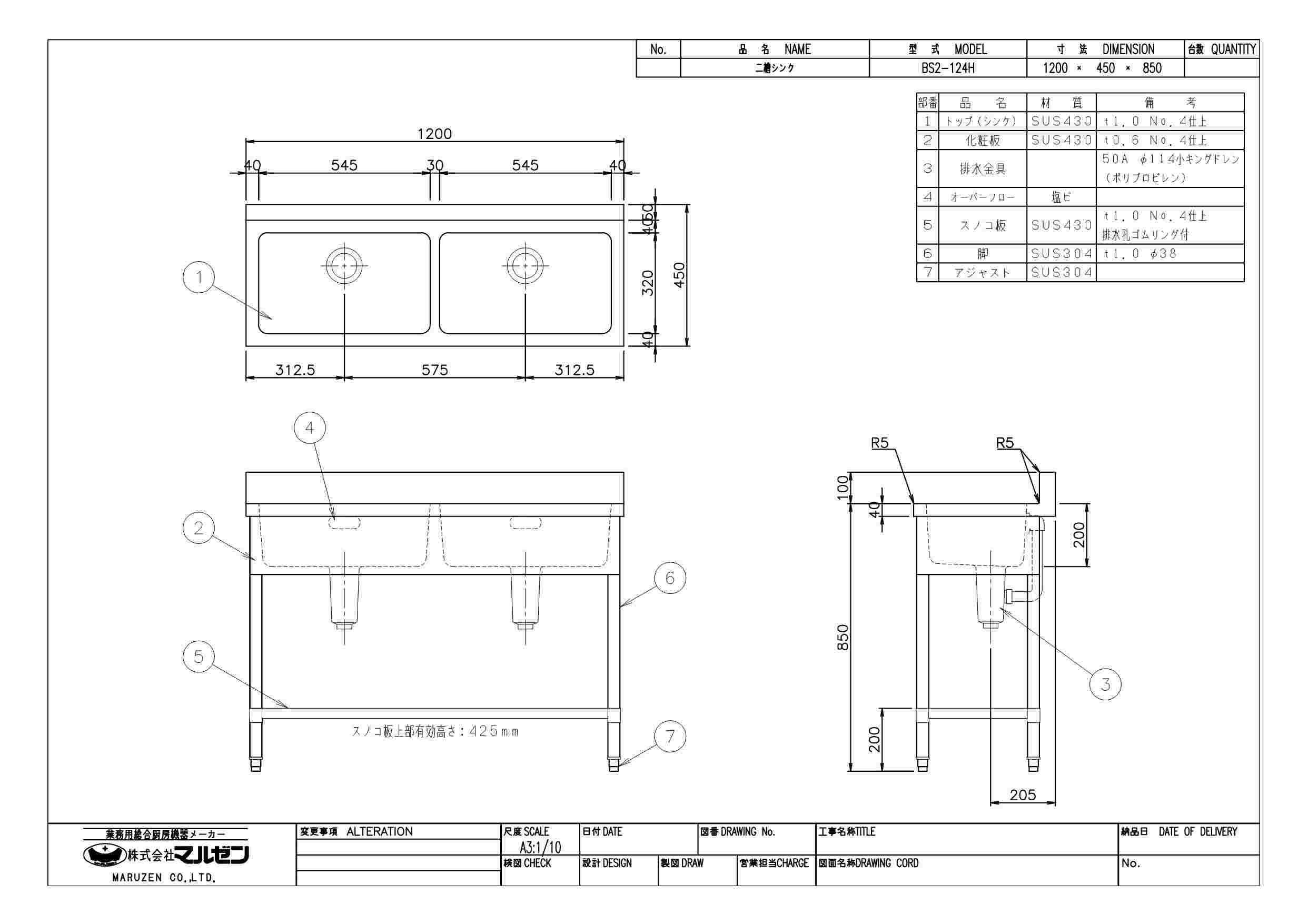 マルゼン 二槽シンク サイズ一覧表