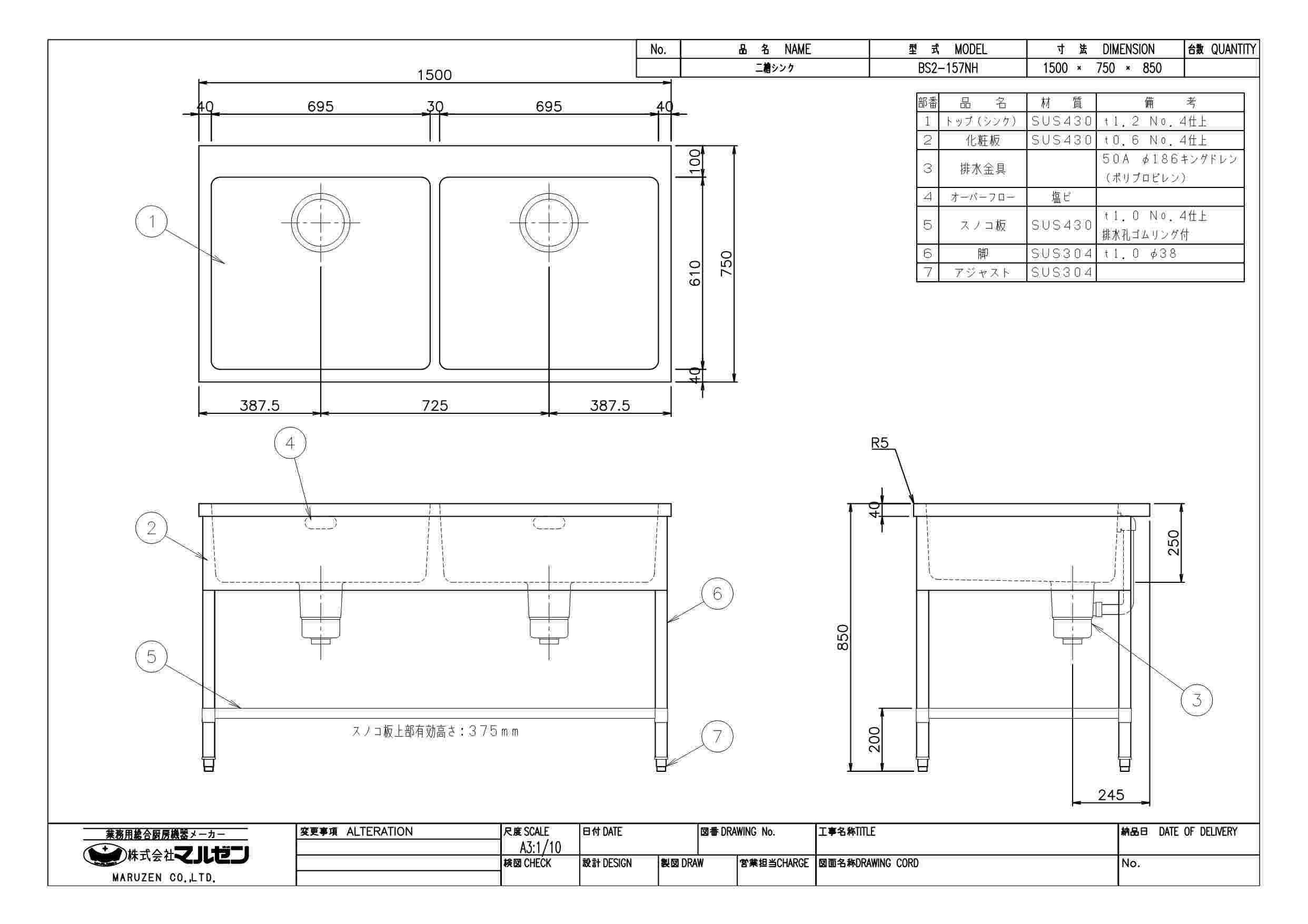 商品名:二槽シンク W1500×D750×H850