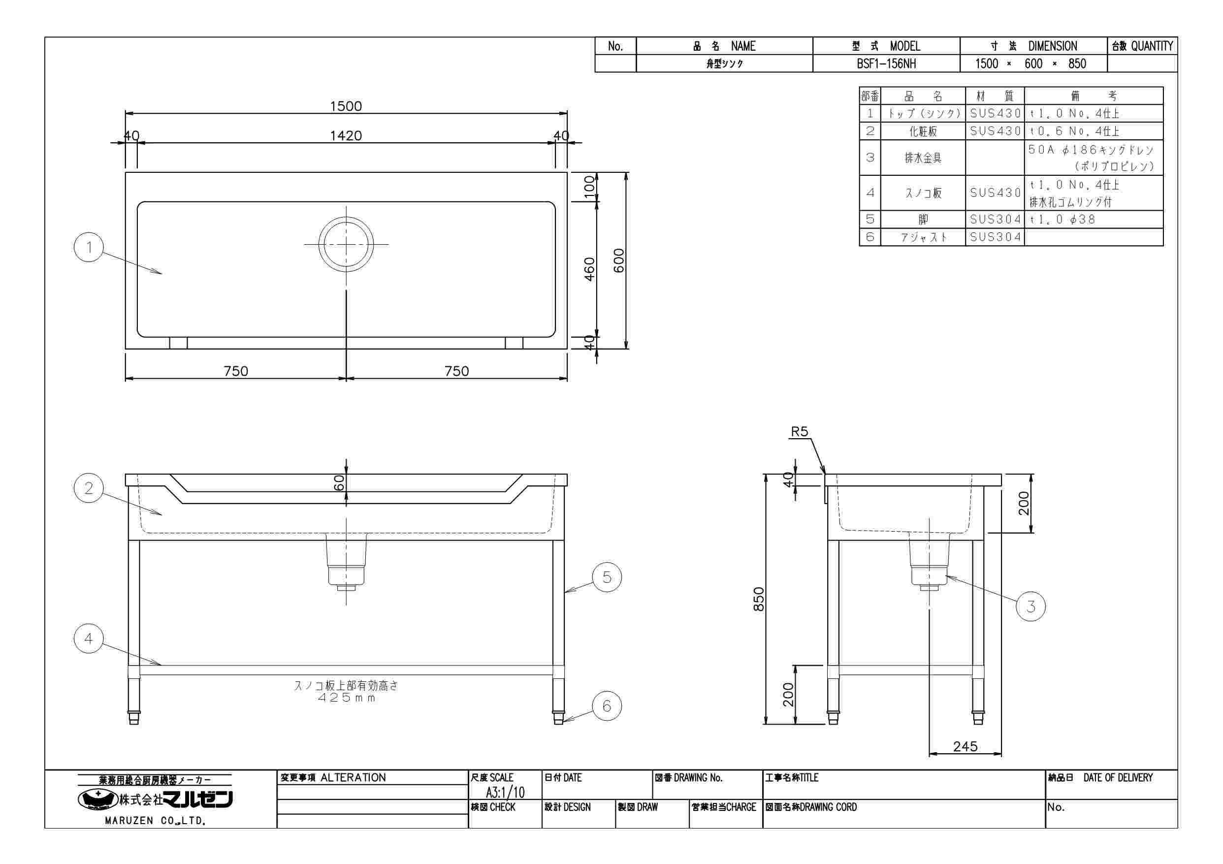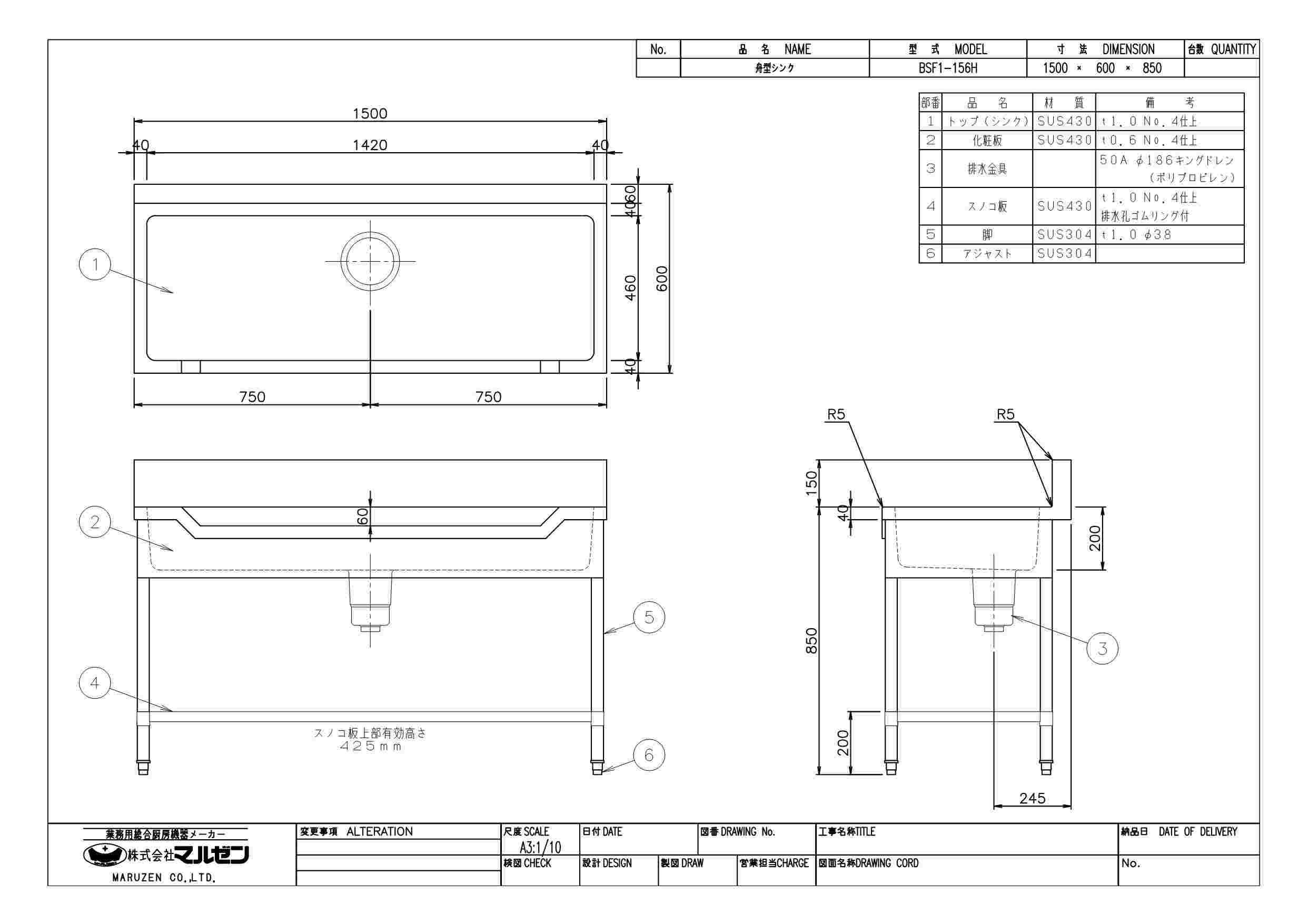 マルゼン 舟型シンク サイズ一覧表