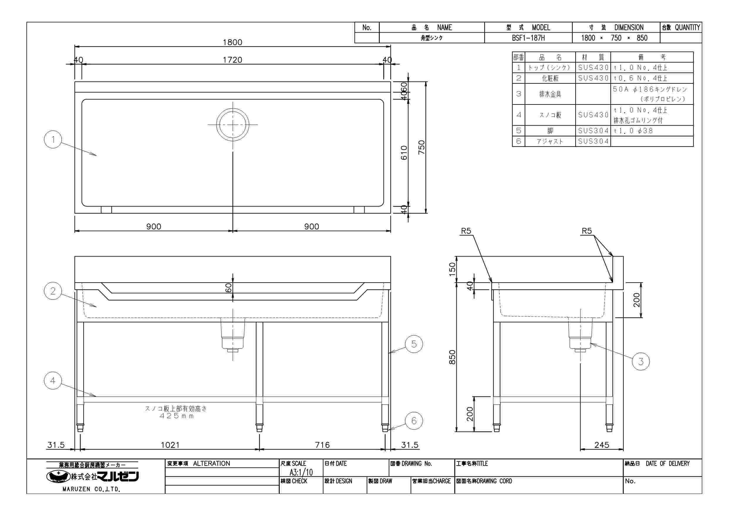 商品名:舟形シンク 三面アール W1800×D750×H850