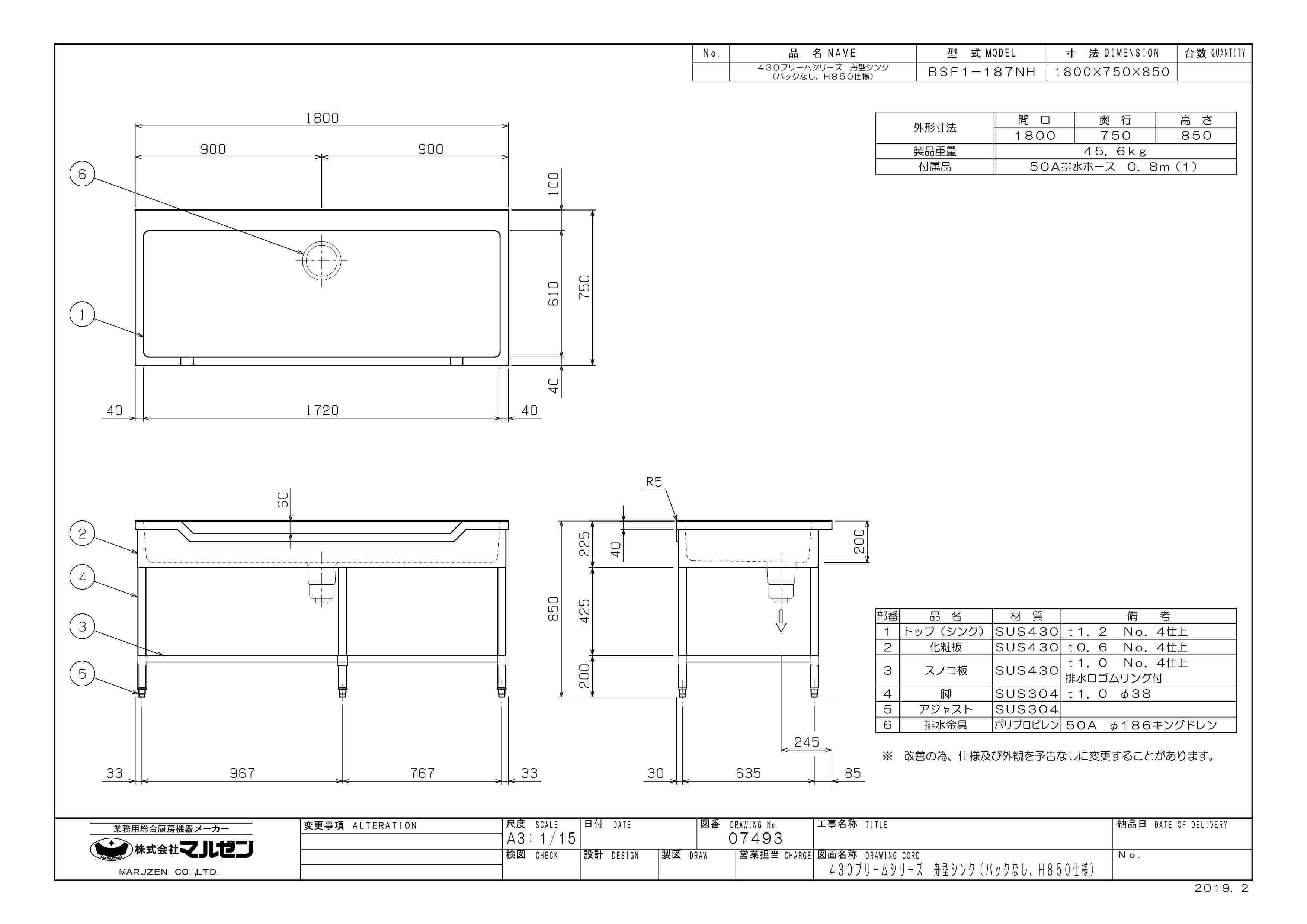【3月末までのお届け分限定価格】BSF1-187H/BSF1-187NH【マルゼン】舟形シンク 幅1800×奥行750×高さ850mm