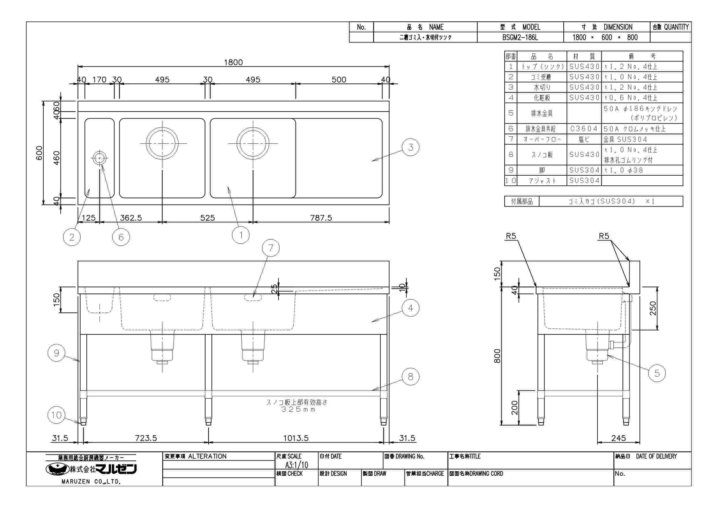商品名:二槽ゴミ入付シンク W1800×D600×H800