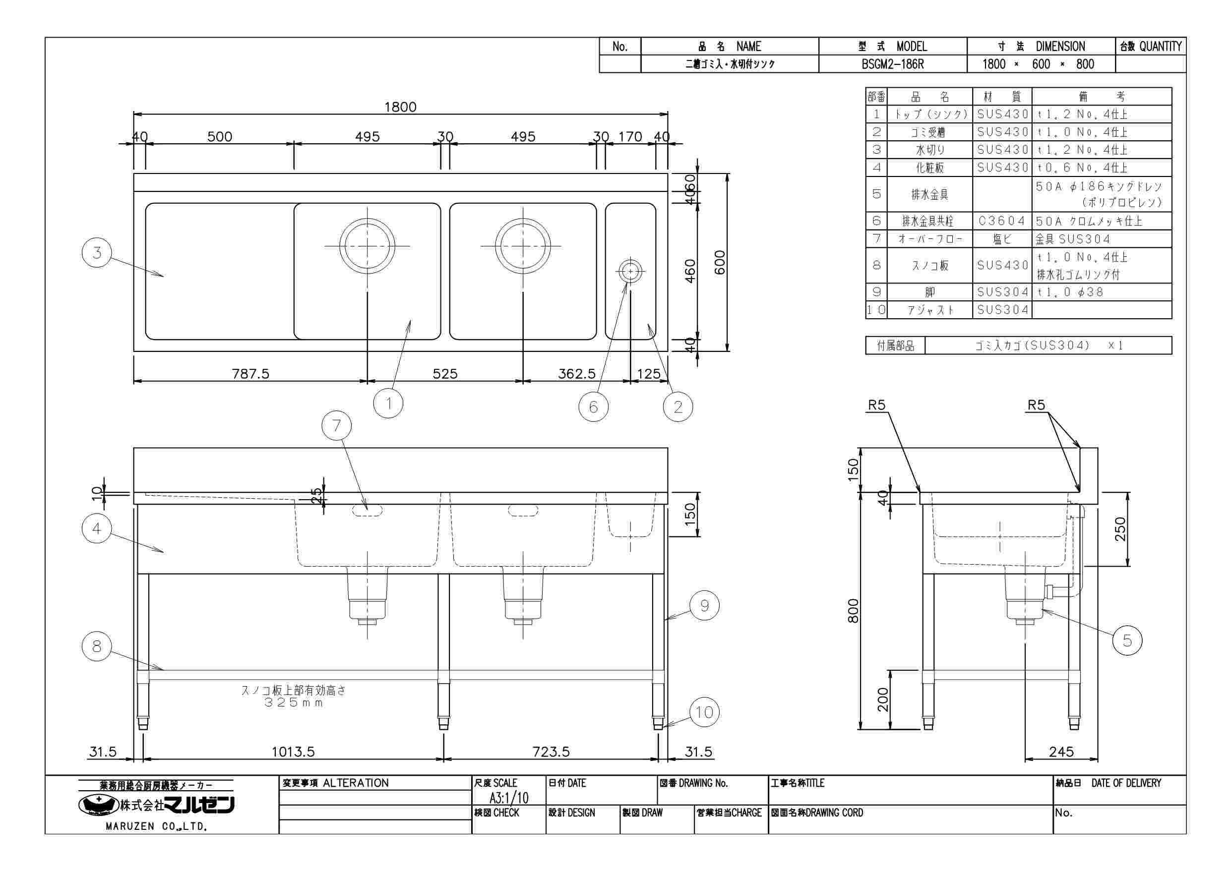 【2月末までのお届け分限定価格】BSGM2-186L,BSGM2-186R 【マルゼン】 二槽ゴミ入付シンク 幅1800×奥行600×高さ800mm