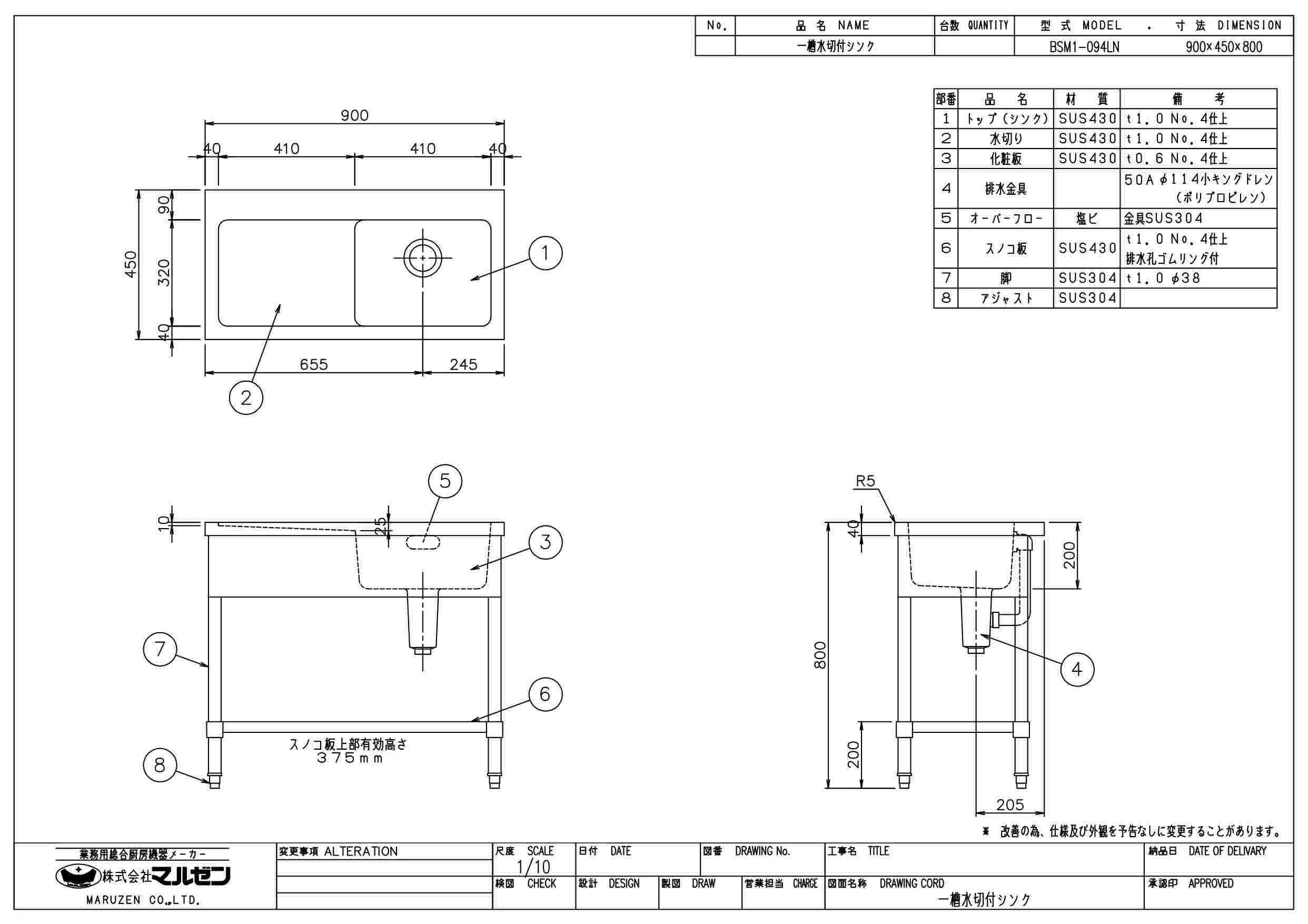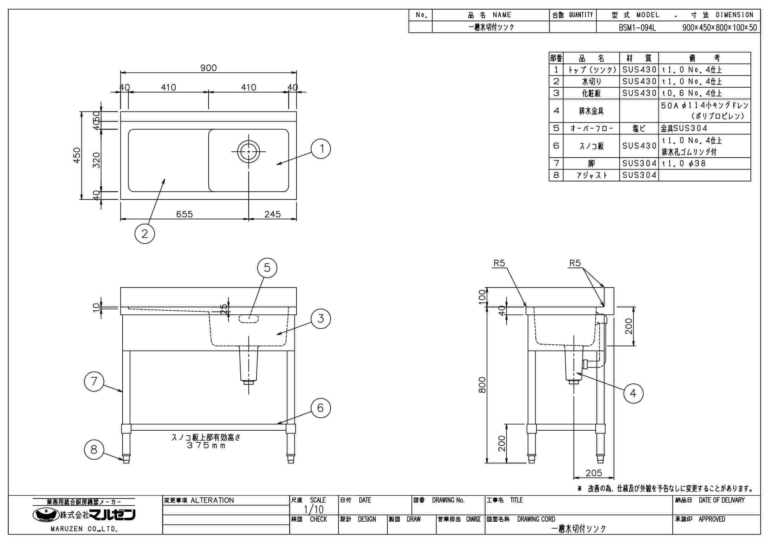 商品名:一槽水切シンク W900×D450×H800