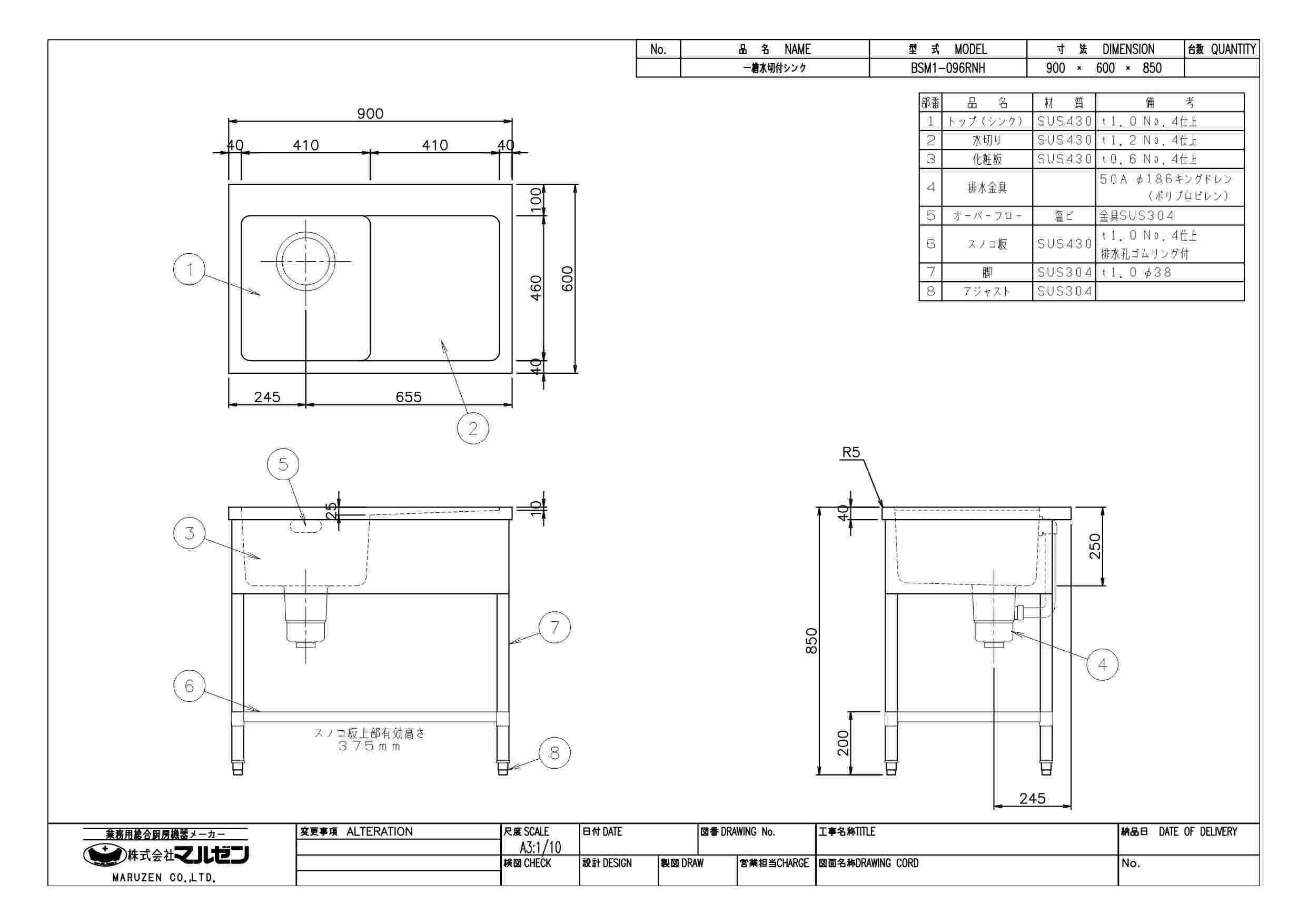 【3月末までのお届け分限定価格】BSM1-096RH/BSM1-096RNH【マルゼン】一槽水切付シンク 右水切り 幅900×奥行600×高さ850mm