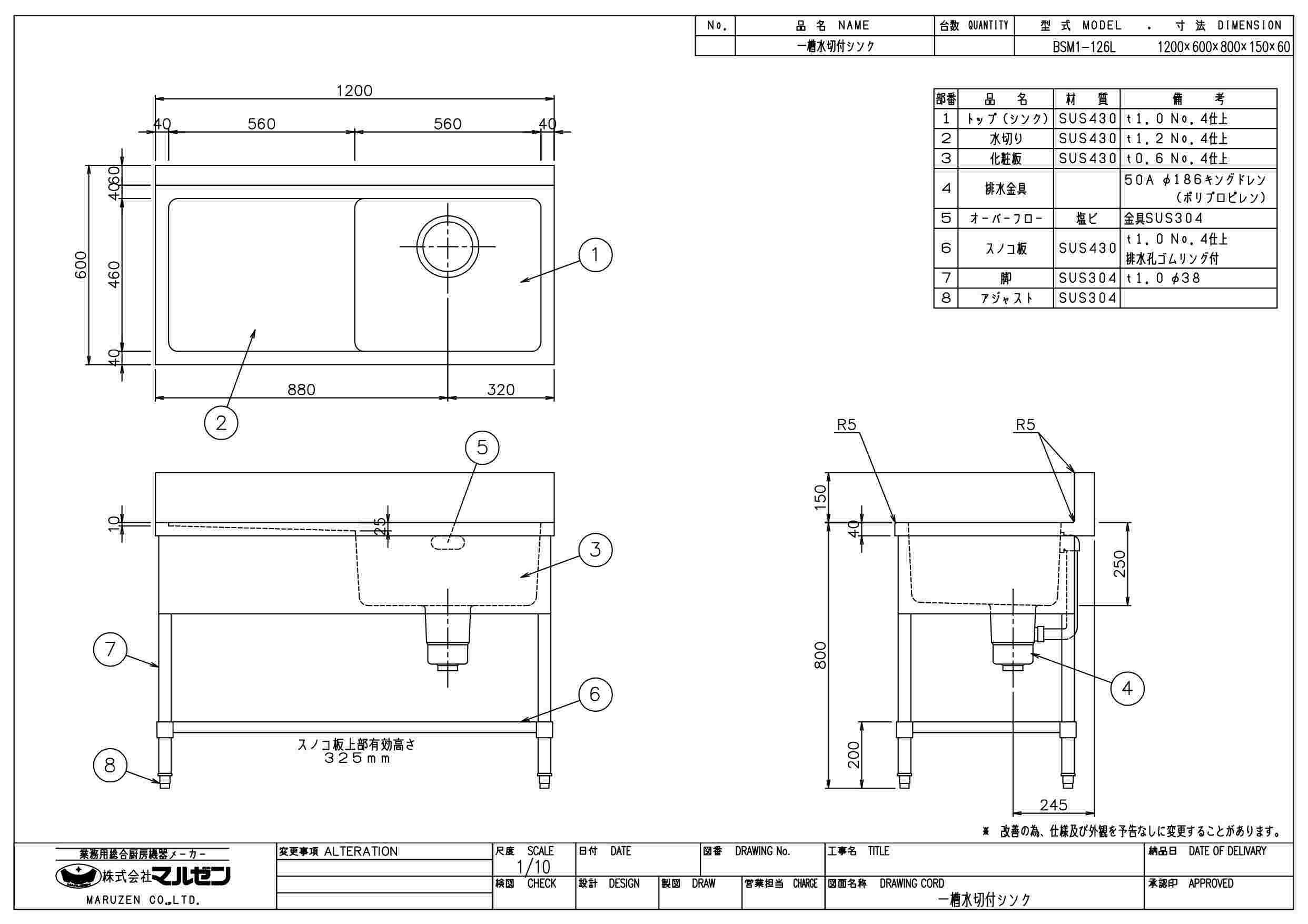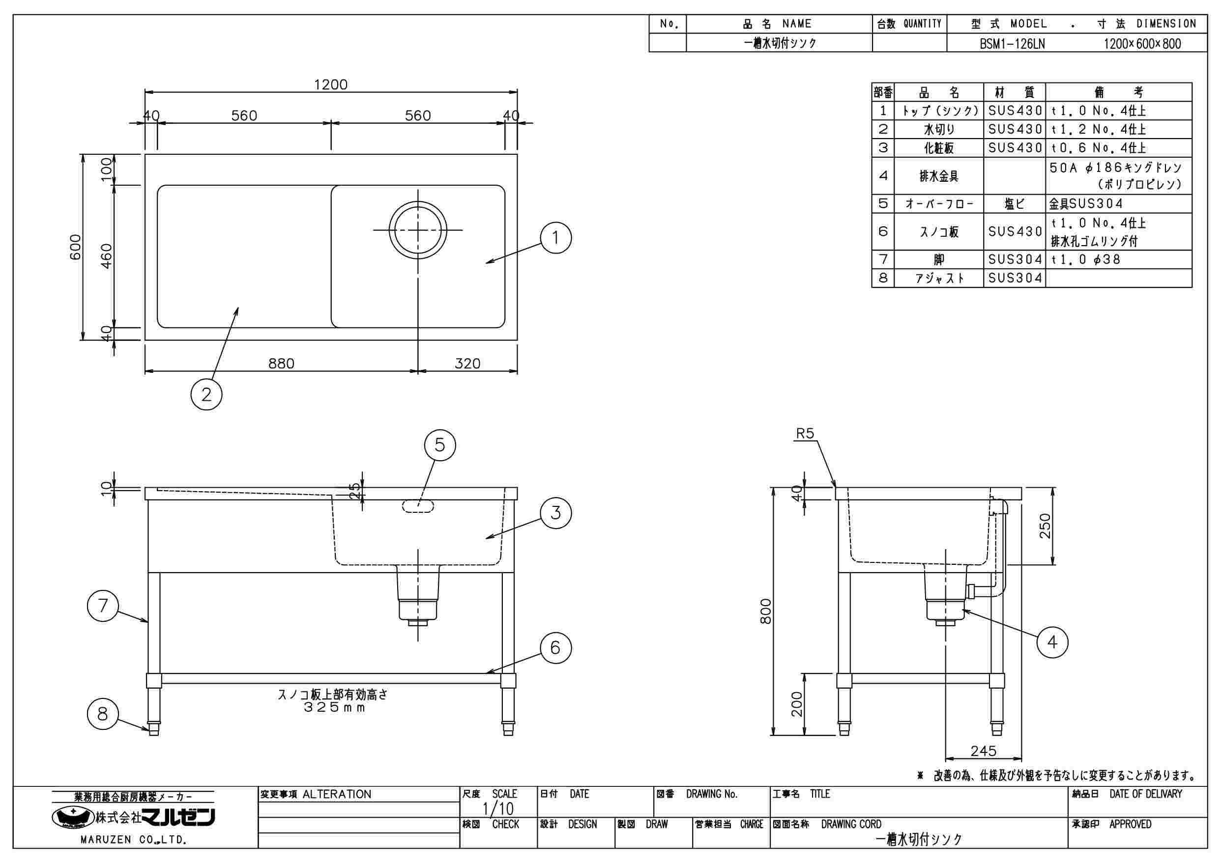 商品名:一槽水切シンク W1200×D600×H800