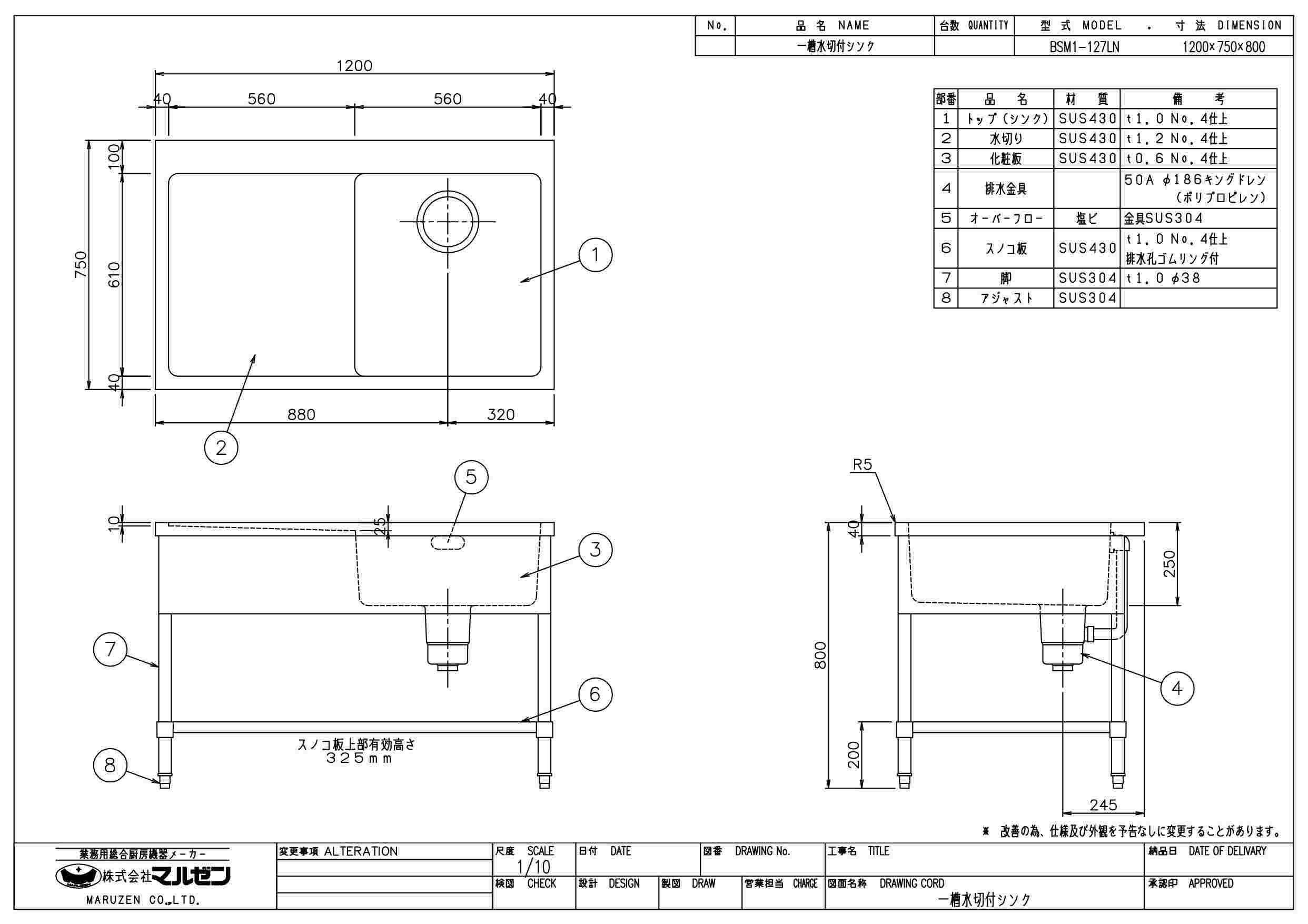 【2月末までのお届け分限定価格】BSM1-127L,BSM1-127LN 【マルゼン】 一槽水切付シンク 左水切り 幅1200×奥行750×高さ800mm
