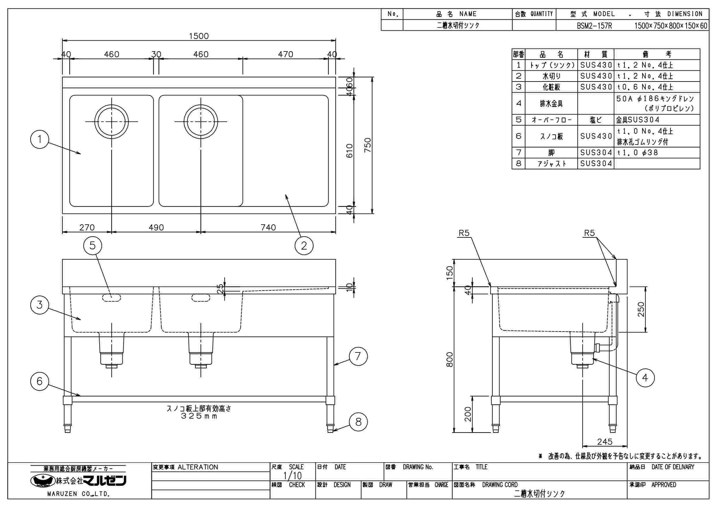 【3月末までのお届け分限定価格】【マルゼン】二槽水切付シンク BSM2-157R,BSM2-157RN 幅1500×奥行750×高さ800mm