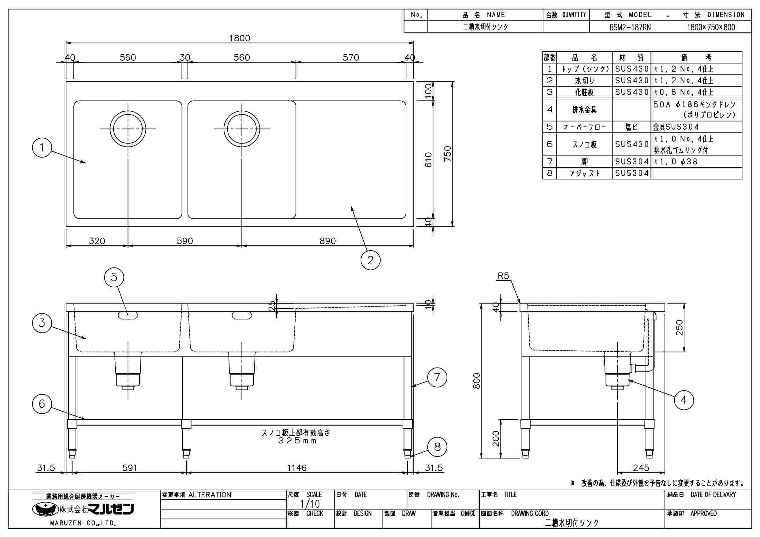 【3月末までのお届け分限定価格】【マルゼン】二槽水切付シンク BSM2-187R,BSM2-187RN 幅1800×奥行750×高さ800mm